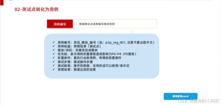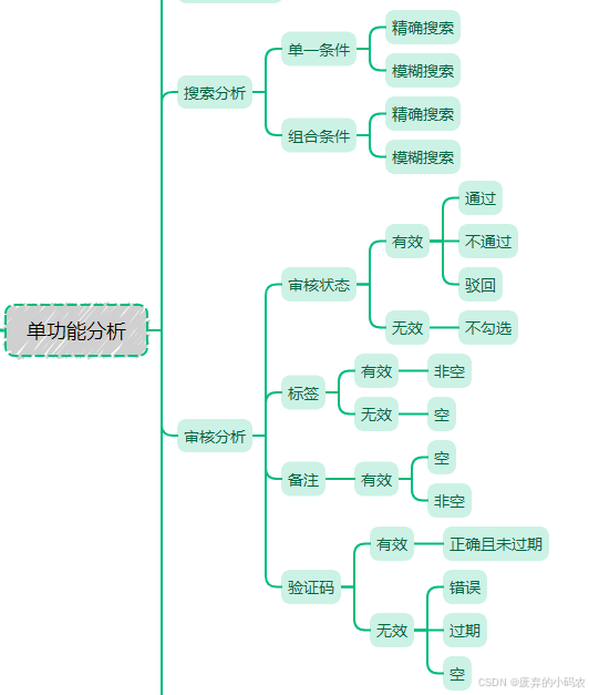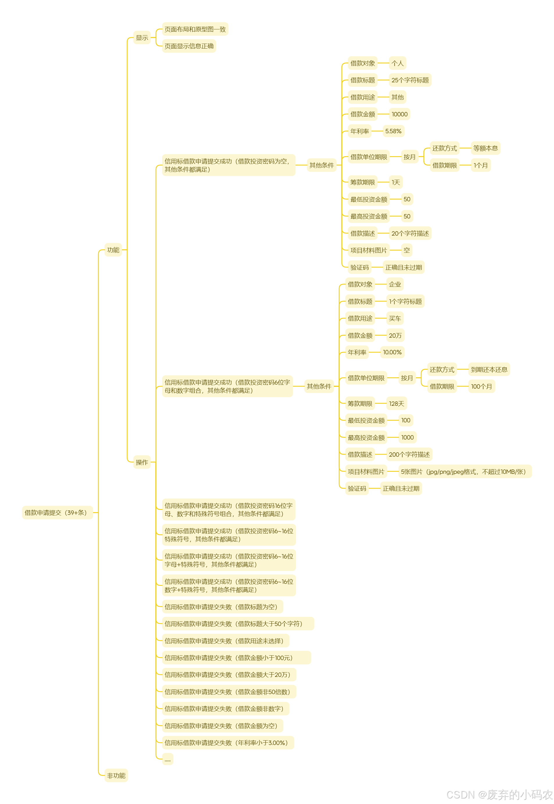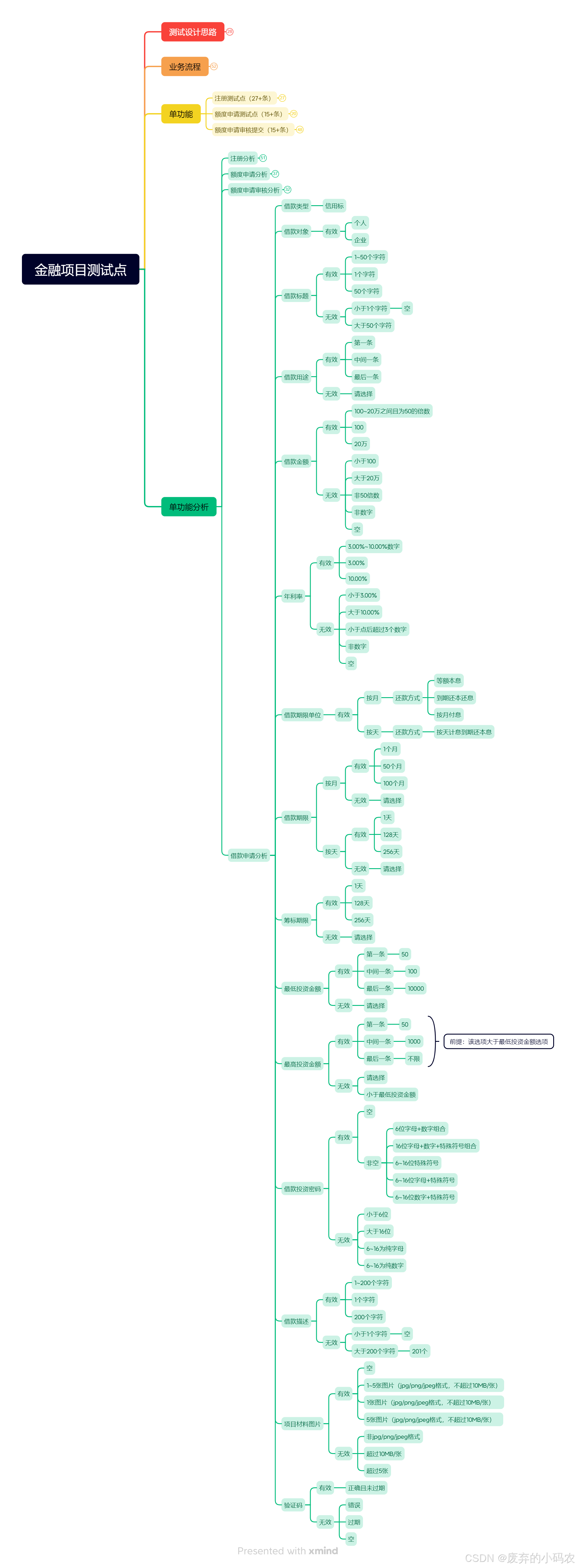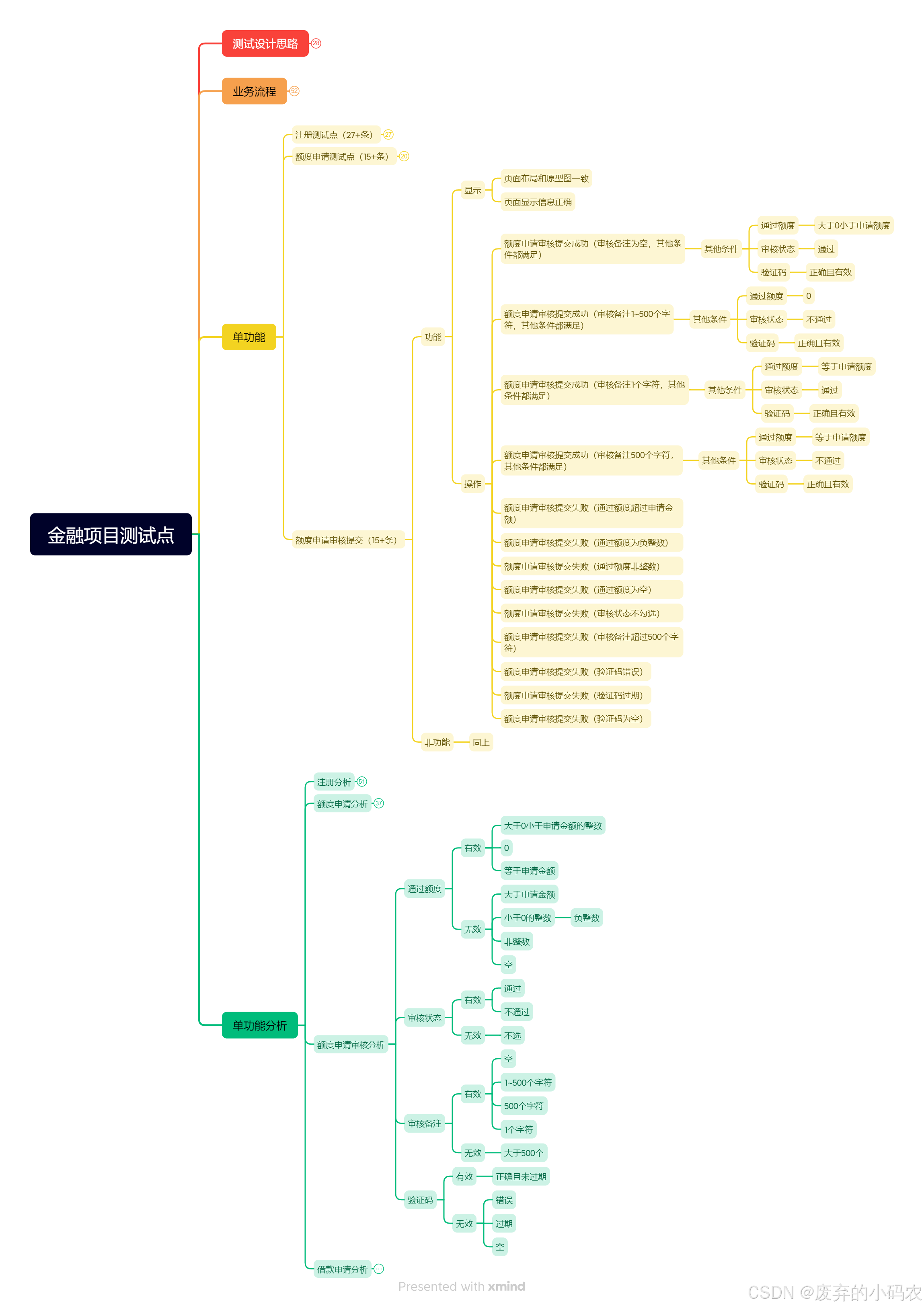 备注:1、获取到需求以后,先熟悉需求,熟悉完需求以后先考虑测试目的,如果不清楚测试目的,就去看标题,一般标题就是测试目的(比如:针对额度申请模块测试),基于该测试目的就去看操作,核心操作就是看提交是否能成功。当可以成功提交后,把每一个影响成功的条件都列举一下,然后优先考虑等价类,等价类的场景就是针对批量数据的大量测试,再加上有边界范围的时候考虑一下边界值,没边界范围的时候直接使用等价类即可(类似申请类型、验证码),最后算测试用例多少条如何计算,单条件中的有效最大数【比如单条件--申请类型,中的有效最大数是4个--信用额度,担保额度,抵押额度,流转额度】就是用例中成功的最大用例数【该用例成功的最多条数是4条】,因为最大的4个可以包含下面其他的有效数;无效比较简单,单个条件中有一项无效,就会有一条失败用例。用例总数就是有效+无效用例数。