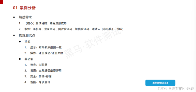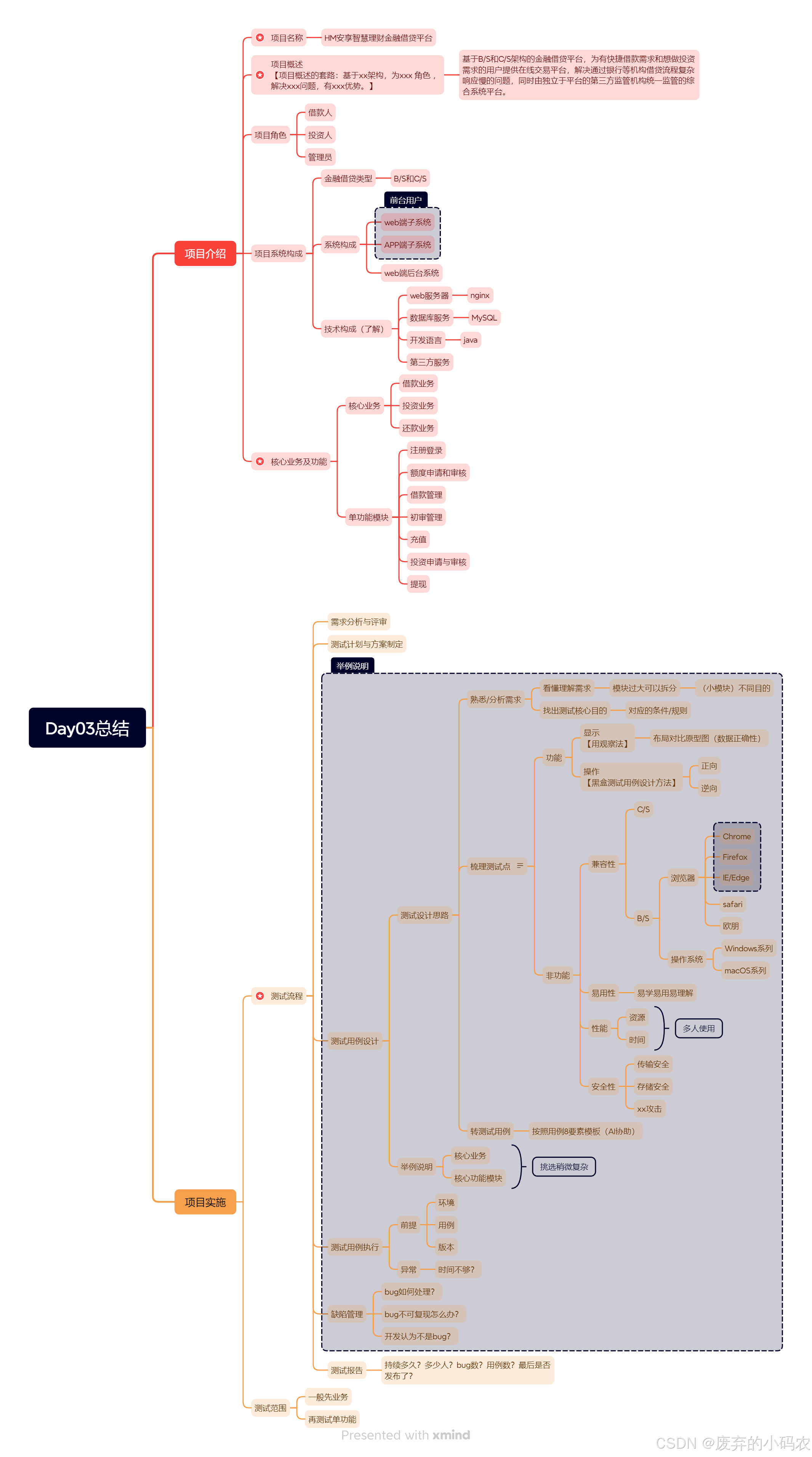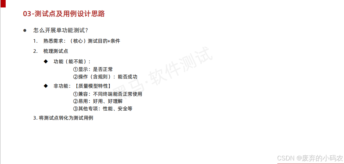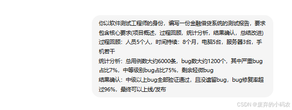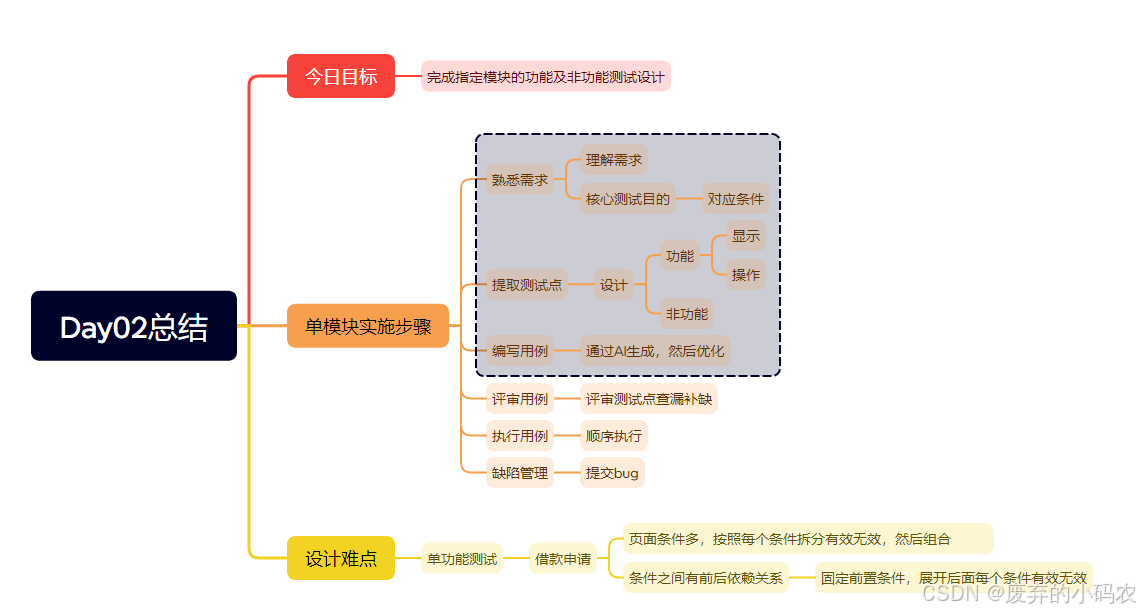 1.如何保障测试用例设计的全面性? - 需求评审:按照质量模型从功能和非功能层面全面覆盖需求 - 技术评审:基于开发设计逻辑进行技术评审完善测试点 - 用例评审:通过团队内部进行测试点/用例的评审【借助于AI工具进行补充完善】 2.如果bug不可复现怎么办? - 从内部出发向外找原因(替换排除法、找外援【打印调试日志】) - 从严重级出发,严重级低,暂时可以不考虑(后续尝试复现);严重级高,需要分析排查 - 思考排查测试过程,测试步骤是啥,测试环境是否有差异(替换法) - 寻求协助:测试老员工,开发协助(记录出现问题的时间,查询对应时间段的日志,通过日志分析) - 如果没有日志,需要开发给一个带有调试日志版本的系统,后续连续跟踪三个 版本后,再未复现,此时放弃 - 后续版本再次出现,直接转/提正式bug,详细描述你的复现过程,并附带日志信息