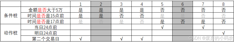 根据判定表得到结果如下:(第三种和第七种情况不存在)