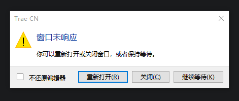 进行了卸载,手工删除工作区域所有文件(C:\Users\wqliu\AppData\Roaming\Trae CN),重装,更换安装目录,重新执行初始化向导,更换其他项目,尝试了 5 次以上,均无法恢复正常,经常报错是crashed,错误码还每次不一样,然后官网上也没找到对应的错误码自查页面。