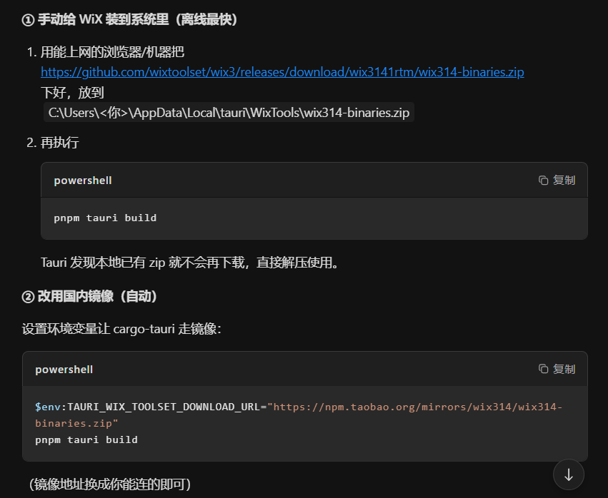 按要求操作 ,两种方式均无效,还是报同样的错误,第一种方式 tauri 无视,第二种方式直接访问ttps://npm.taobao.org/mirrors/wix314/wix314-binaries.zip,提示 404。