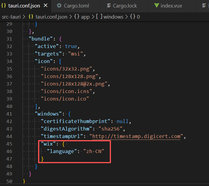 注意这里的配置只对 msi 有效,至于另外一种工具 nsis,我并不需要,直接就弃了,将 targets 也改成了 msi。