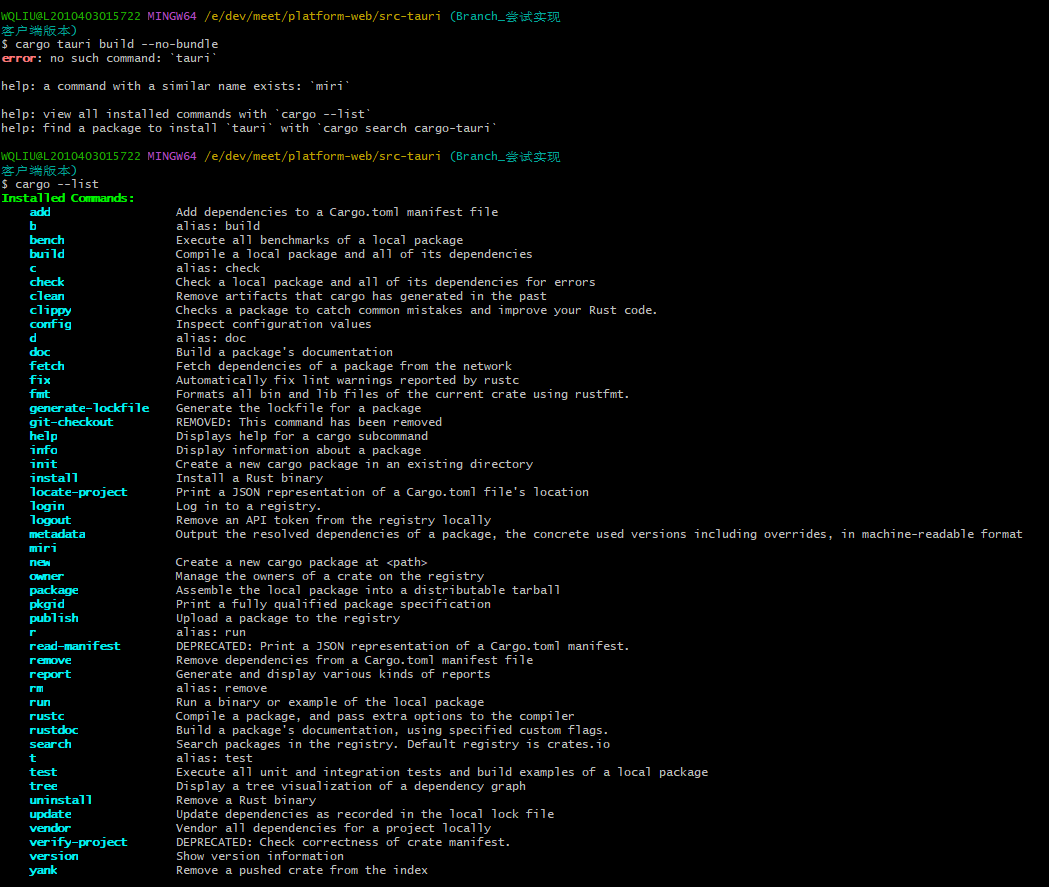 按照上述方案,依旧不可行,cargo 根本就没有 tauri 的命令参数。