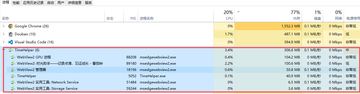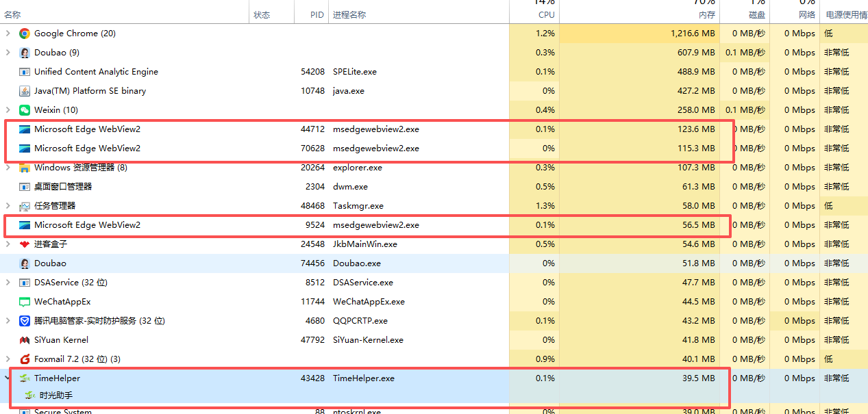 任务管理器 → "进程"标签页 按 Pid 树 展开时,会把 WebView2 各子进程挂到你的 exe 下(见下图"SWebView2: 时光助手"),于是出现: