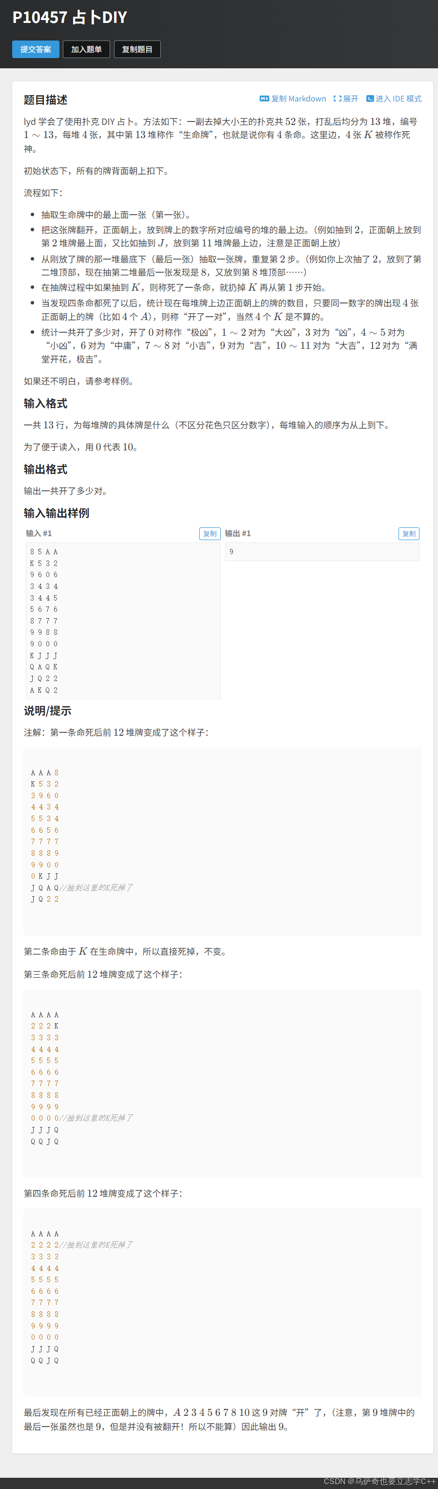 然后本题的模拟逻辑是可以简化的,如果按照题意写拿牌,插入牌的代码是比较难实现的,我们可以用一个巧妙的方法,创建一个cnt数组,cnt[i]表示第i堆牌还有多少张牌没被翻的牌,所以cnt[i]会被初始化为4,而cnt[i]的值又刚好是这堆牌最后一张没被翻的牌的下标,所以拿一张牌x,把牌x放在x堆的最上面,然后把x堆的最下面的一张牌拿出来的操作就可以简化成拿一张牌x,直接拿x堆的最下面的一张牌,然后cnt[x]--。