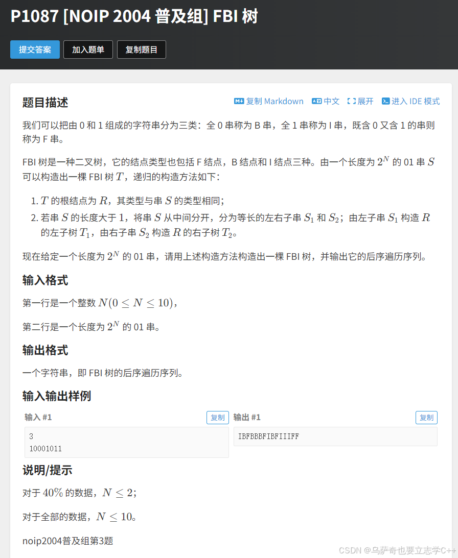 1、判断子串类型我们会先想到遍历整个子串,检查字符串中字符0和字符1的出现情况,这种方法是可以解决问题的。但是还有一种更优的做法,利用前缀和整型数组f预处理输入的01字符串,当我们拿到一个区间[left,right],我们先算出[left,right]的区间和,也就是f[right] - f[left - 1],然后判断区间和和right - left之间的关系,如果区间和等于right - left + 1,说明区间全为1,那么当前字符串类型就是I,如果区间和等于0,说明区间全为0,那么当前字符串类型就是B,否则就是F。