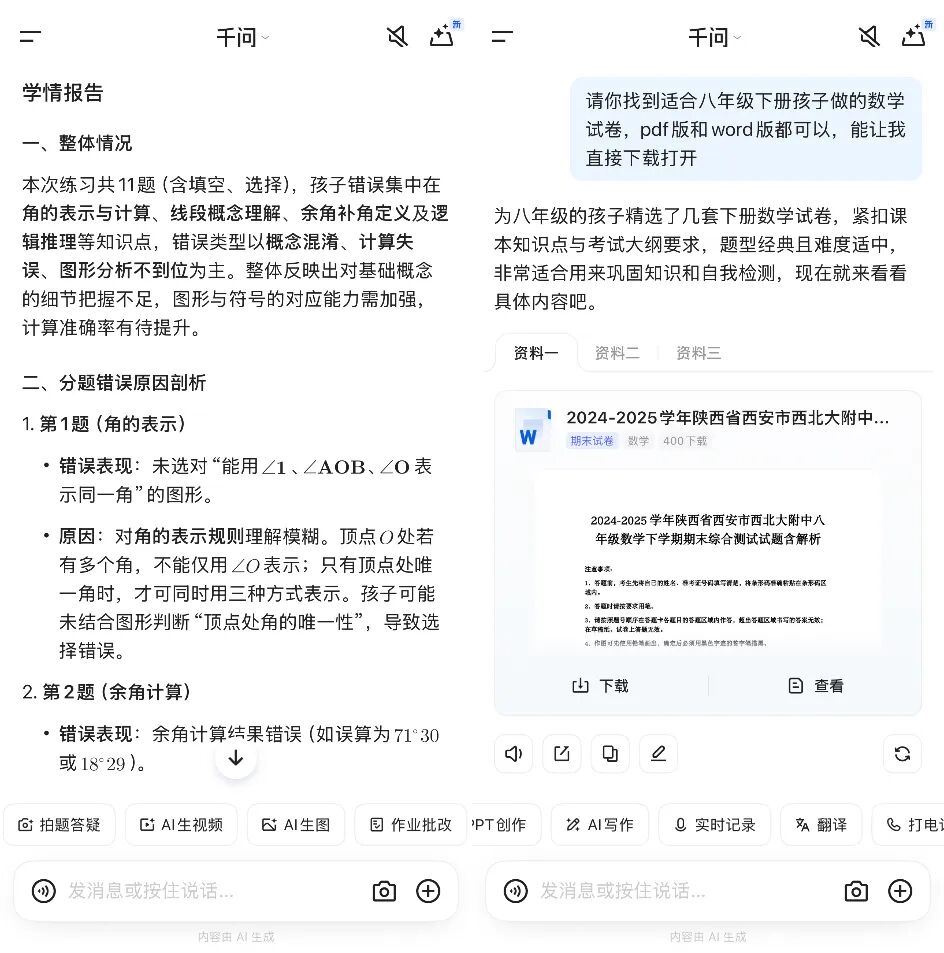 而且最重要的是千问提供数百万道真题免费使用,只需要一句话即可拥有适龄段的试题卷子,免去了家长到处找题目的烦恼,真正做到"省心又省力"。