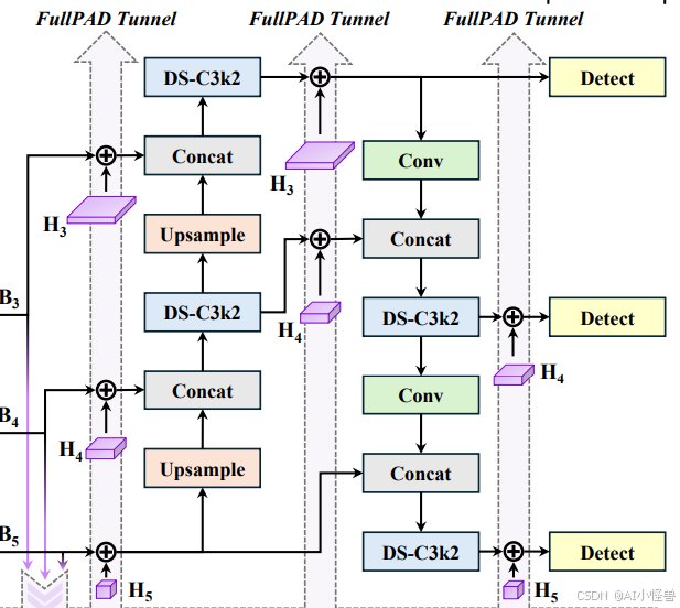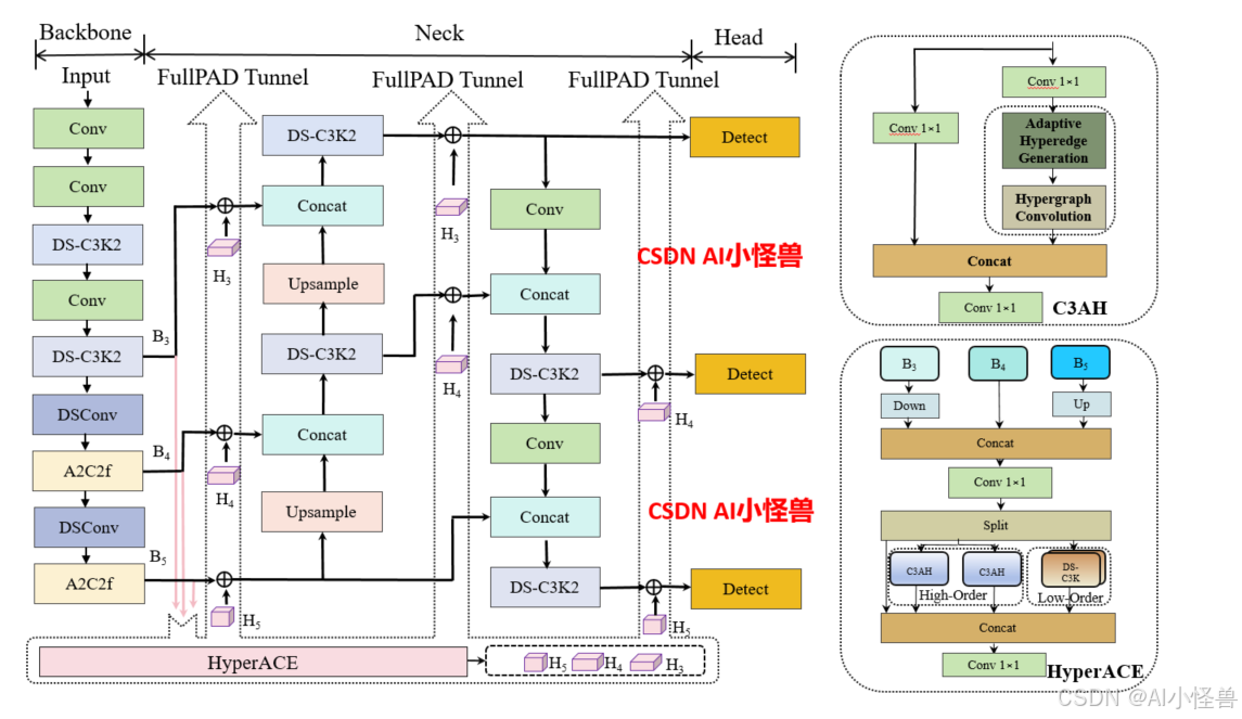 多通道特征传递 :打破传统的 "骨干→颈部→头部" 单向计算范式,通过三条独立通路传递特征,即主干 - 颈部连接层、颈部内部层、颈部 - 头部连接层,将 HyperACE 聚合后的多尺度特征,通过这些 "隧道" 分发回网络的不同位置,实现细粒度信息流与全流程表征协同。