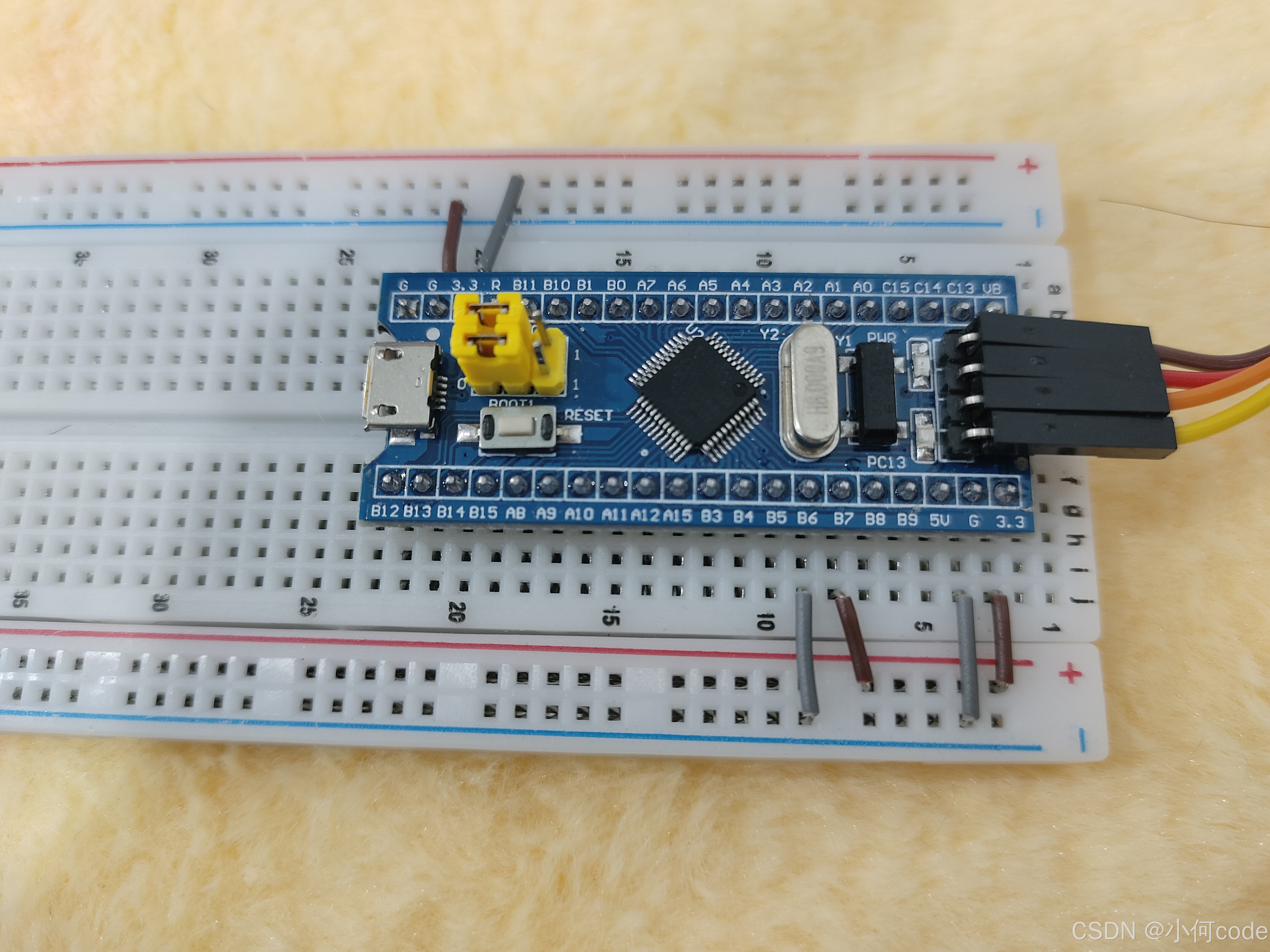 在面包板上插一下电路,先用跳线引一下电源,负极供电孔引到PB6的位置。正极供电孔引到PB7的位置。