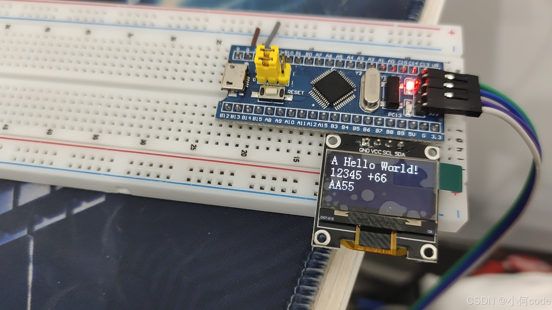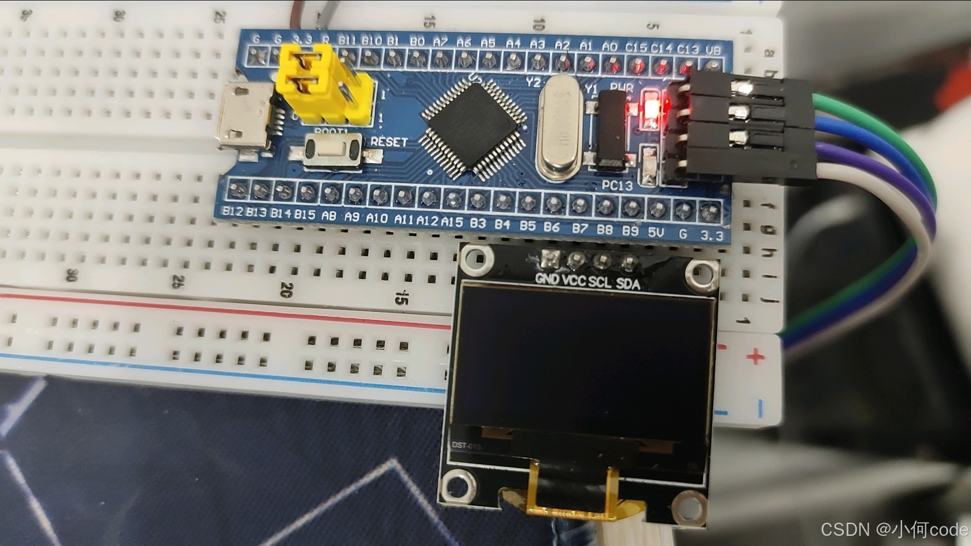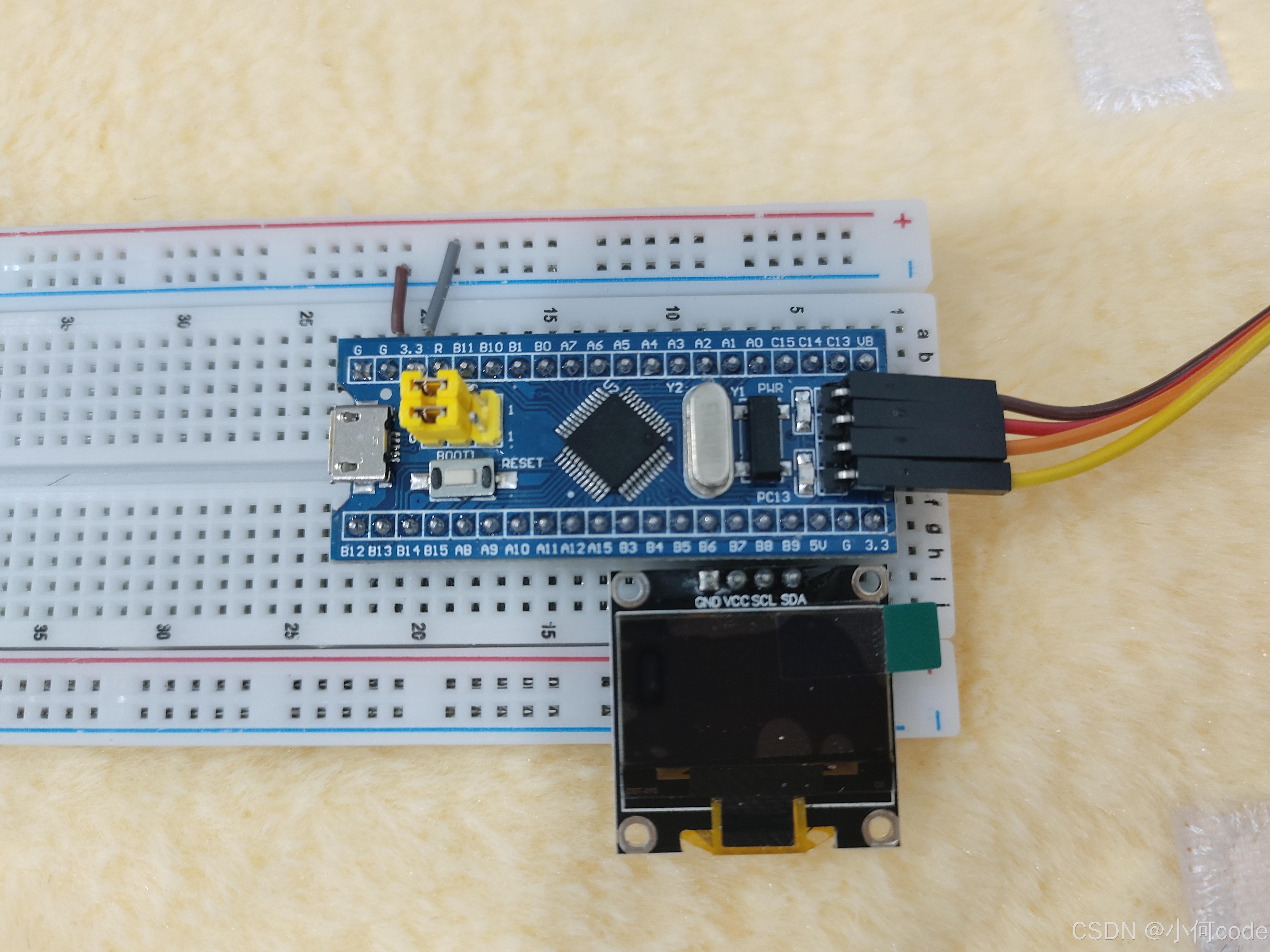 然后拿出OLED屏幕,插到PB6到PB9的这四个孔里,这样就完成了。