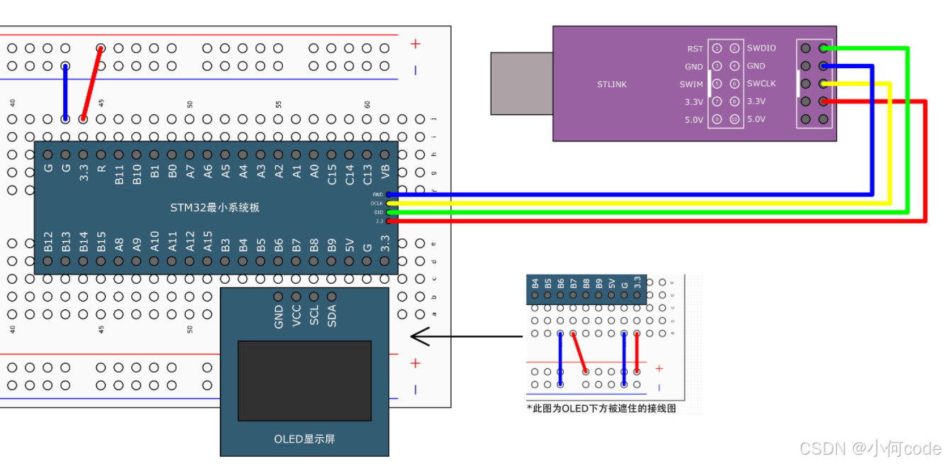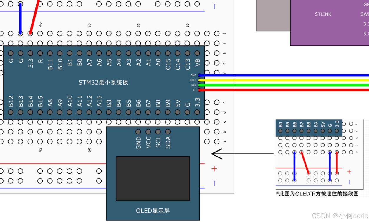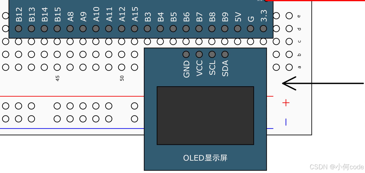 在这里我们使用的是四针脚的OLED屏幕,GND接负极,VCC接正极。在OLED的下面,先插上两根线,把OLED的GND引到负极供电孔,OLED的VCC引的正极供电孔。另外这个供电孔也会同时接到STM32的PB6和PB7两个引脚。