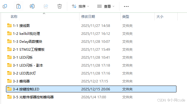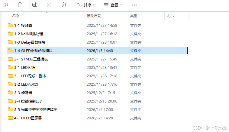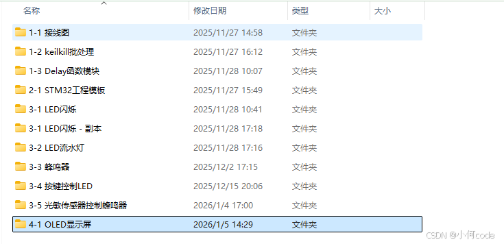 回到STM32Project工程文件夹,复制一下【3-4 按键控制LED】的工程文件夹,改个名字叫:【4-1 OLED显示屏】。