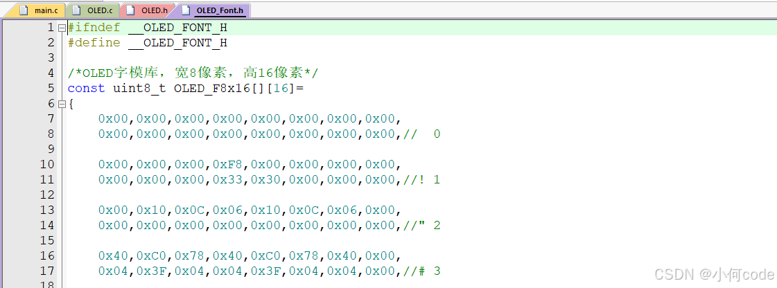 OLED_Font.h文件里面存的是OLED的字库数据。因为这个i d显示屏是不带字库的,想要显示字符、图形,还得先定义字符的点阵数据。这里就是这些字符的点阵数据,也就是字库。