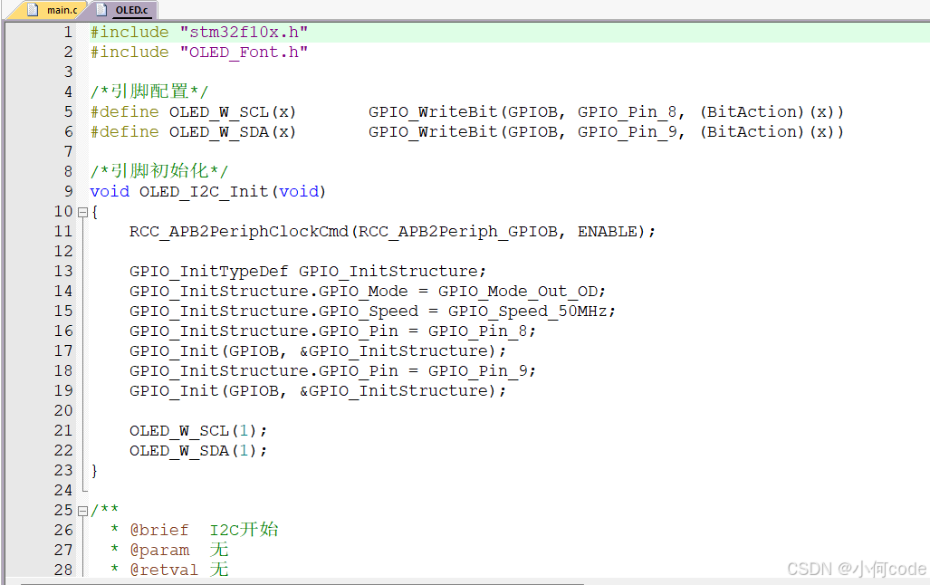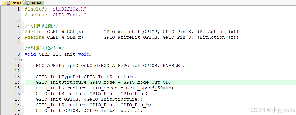 OLED.c文件里面就是函数的主体代码,包括引脚配置、引脚初始化、I2C通信的基本时序和OLED用户调用的代码。