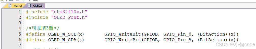 如果你想修改,先把上面这两行引脚配置改一下,再把下面的端口初始化改一下。剩下的都不需要修改,就可以直接使用这个OLED驱动函数模块。