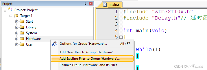 之后打开Keil,在Hardware处右键,添加已经存在的文件。