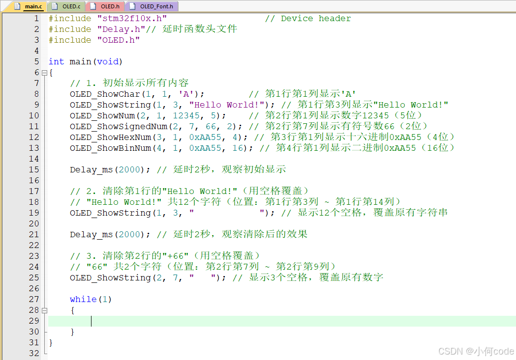 原因:显示字符时,OLED 驱动会把字符的点阵数据写入指定坐标的显存区域;空格字符(' ')的点阵数据是全 0(无点亮像素),因此用 OLED_ShowString 显示空格,相当于把对应位置的显存数据置 0,视觉上就 "清除" 了原有字符。