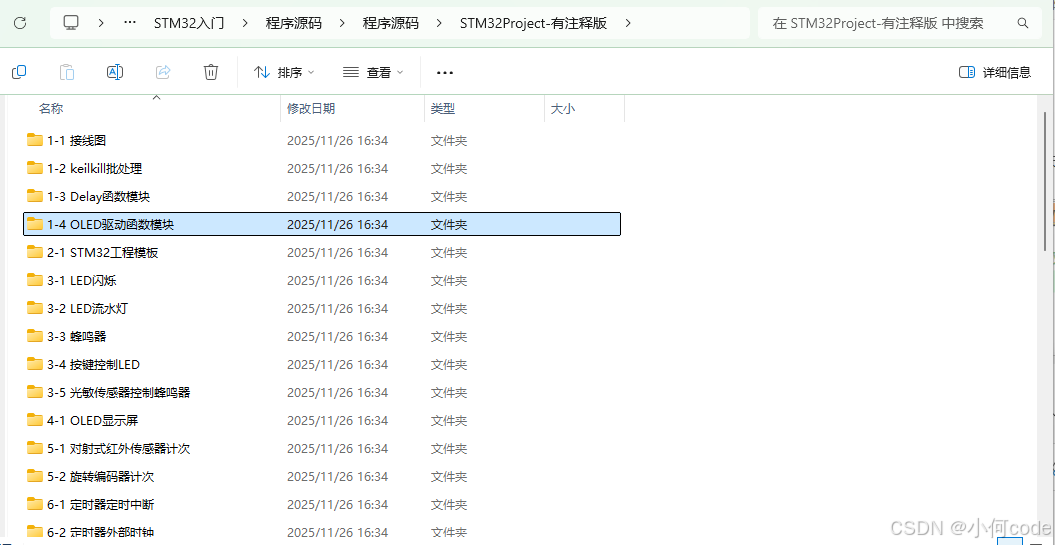 打开资料文件夹,在【STM32入门\程序源码\程序源码\STM32Project-有注释版】中找到【1-4 OLED驱动函数模块】。