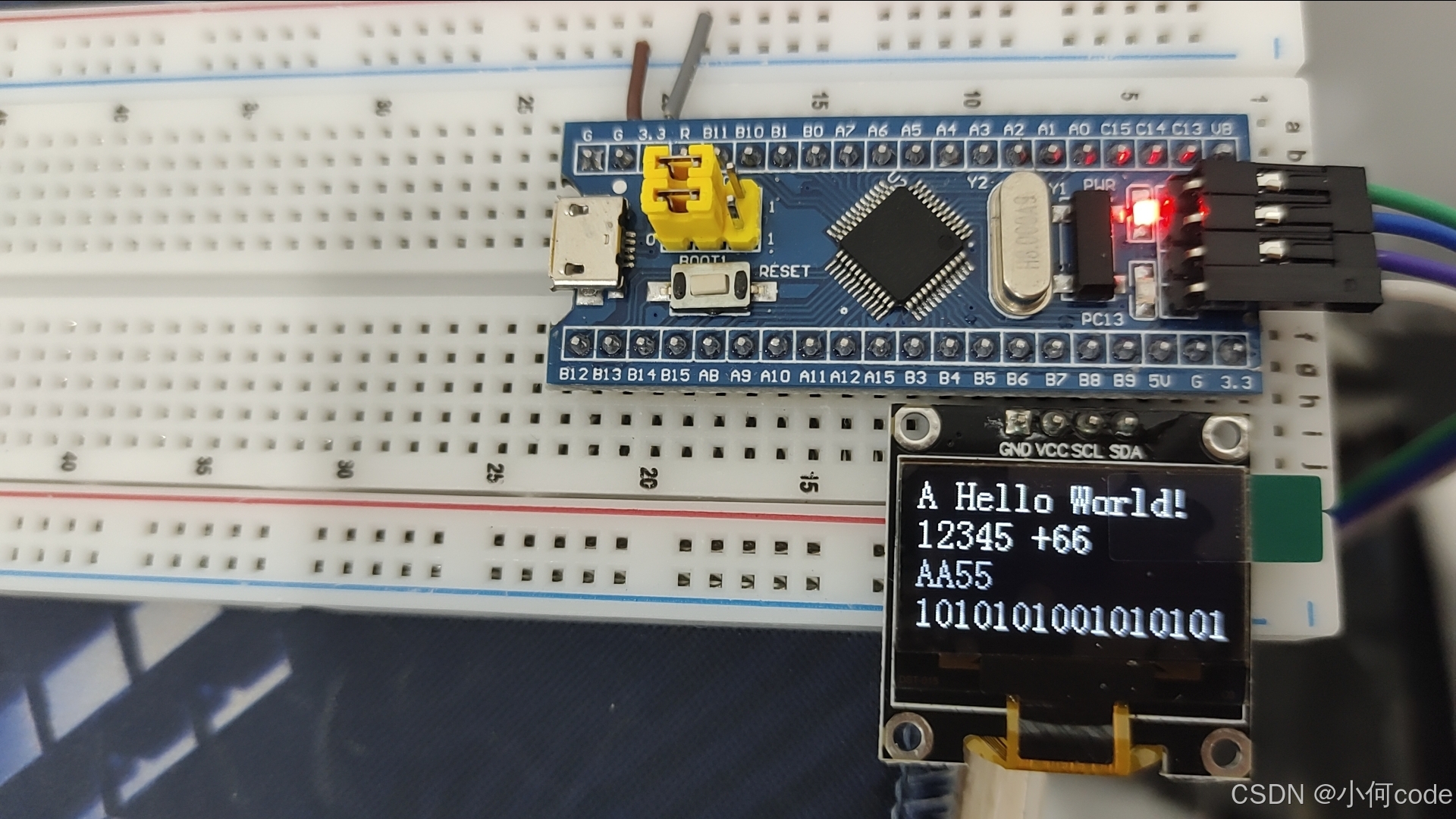 插好供电跳线之后,再把OLED插到PB6到PB9这四个口。这样OLED就接好了,此时OLED的SCL接到PB8,SDA接到PB9。