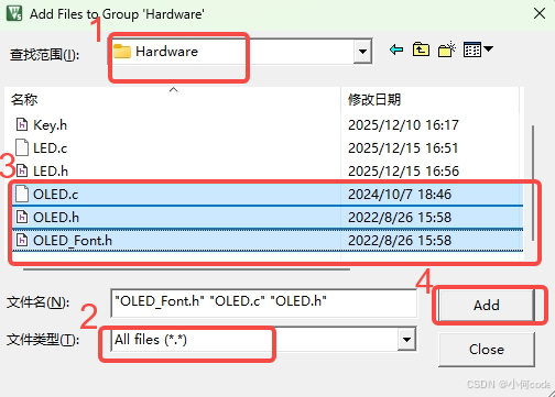 打开Hardware,文件类型选择All files,按住CTRL选择OLED的三个文件,然后点击Add。然后点击Close。