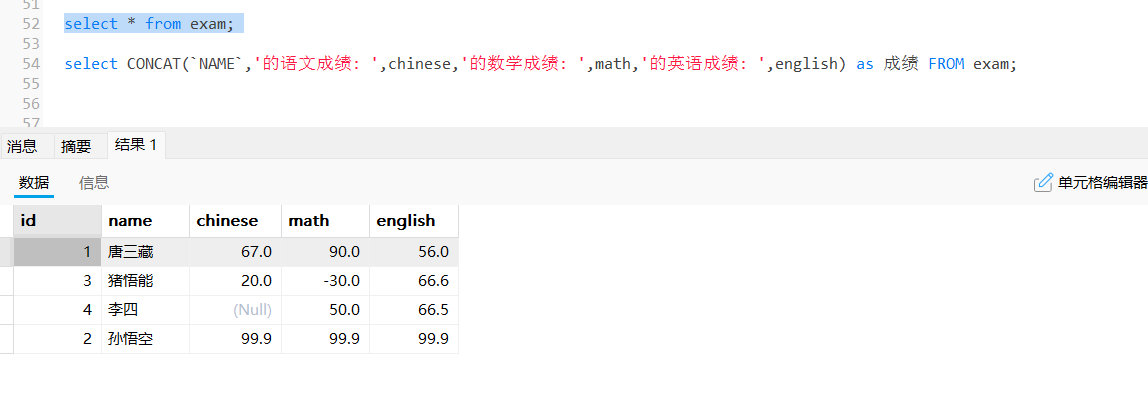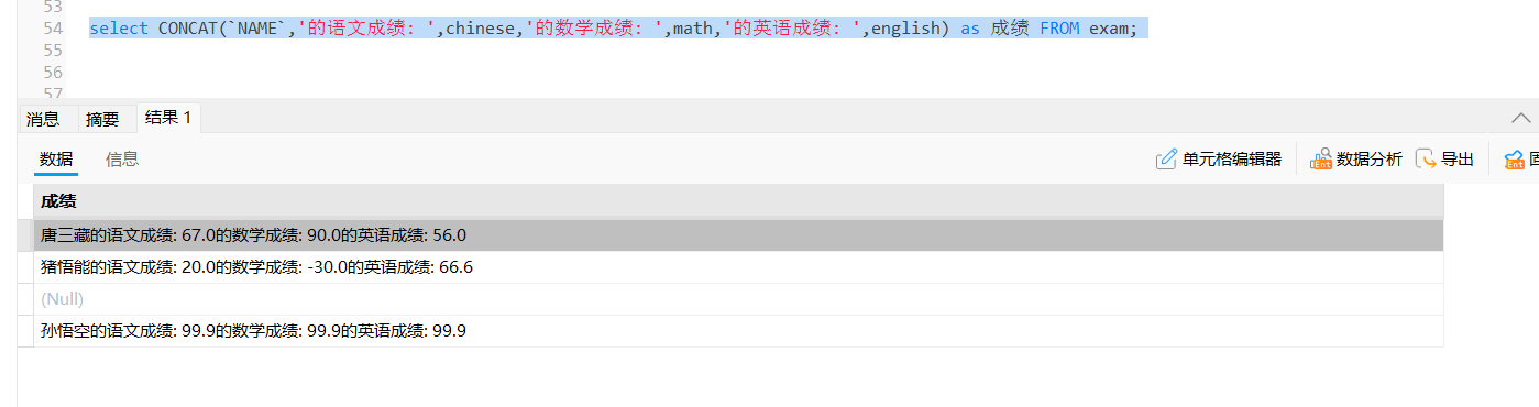 显示学生的考试成绩,格式为 "XXX的语文成绩:XXX分,数学成绩:XXX分,英语成绩:XXX分"