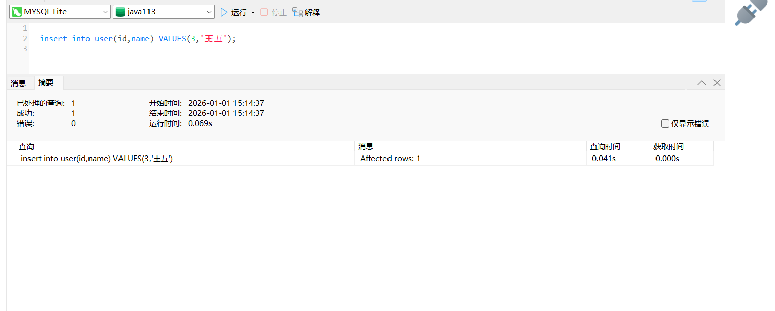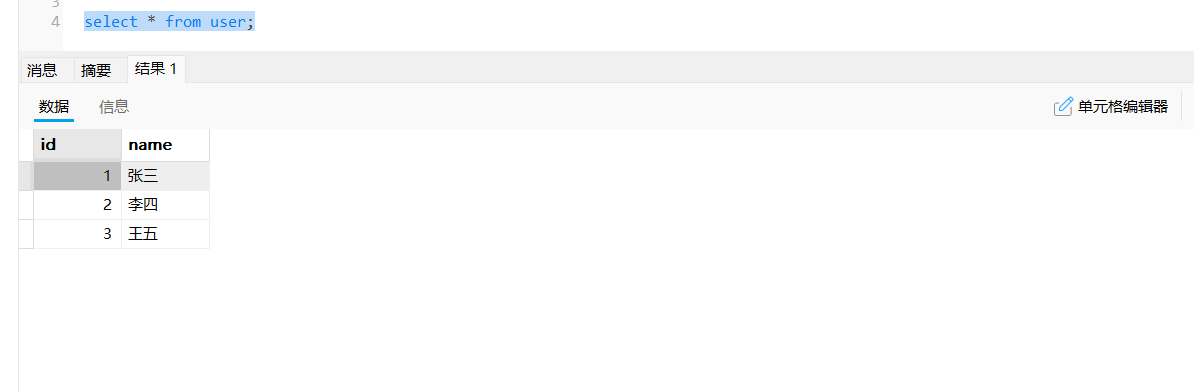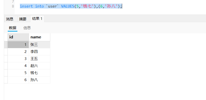 insert into user(id,name) values(4,'钱七'),(5,'孙八');