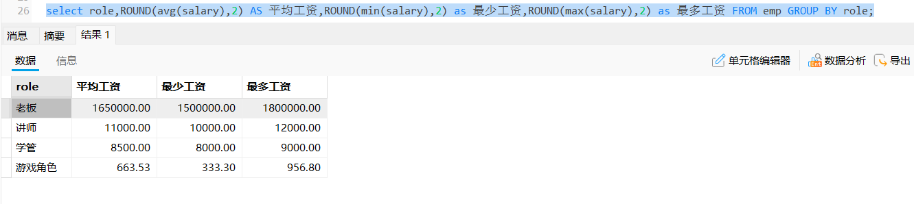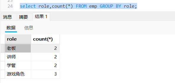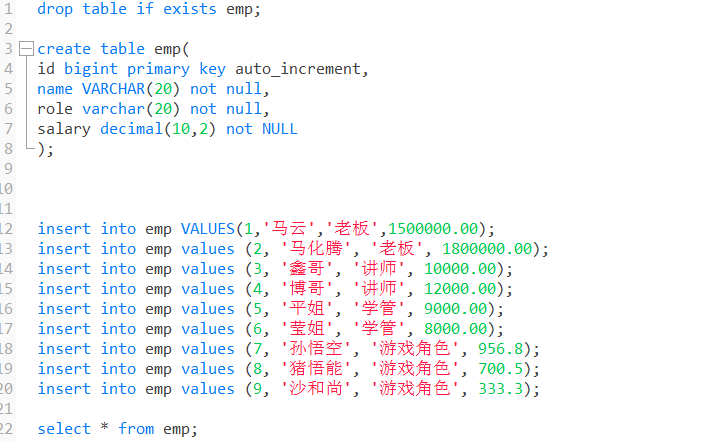 准备测试表及数据职员表emp,列分别为:id(编号),name(姓名),role(角色),salary(薪水)