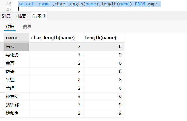 显示所有参加考试的学生姓名、姓名字符数和字节长度
