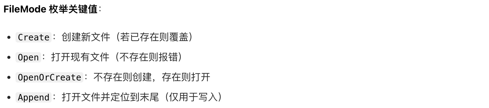 FileMode.OpenOrCreate, // 不存在则创建,存在则打开