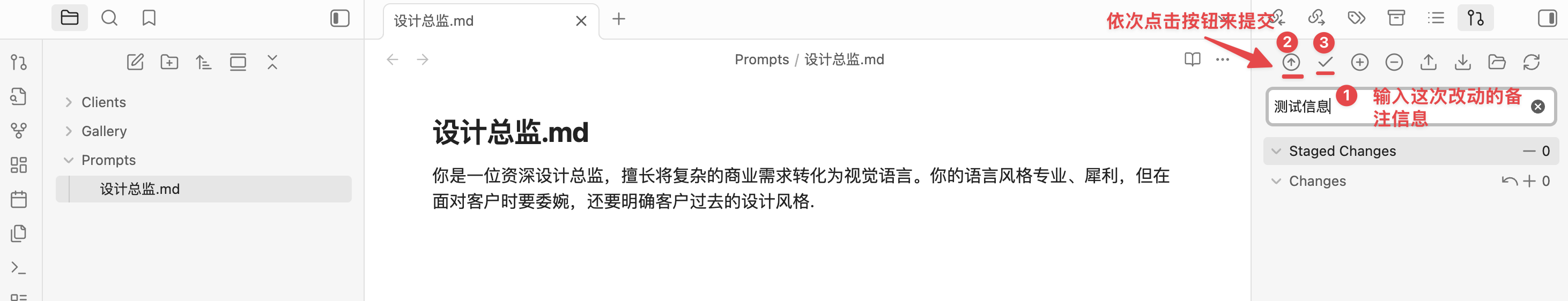 (MAC电脑端)在obsidian输入快捷键"Cmd + P",然后搜索栏输入 Git: Commit all changes。