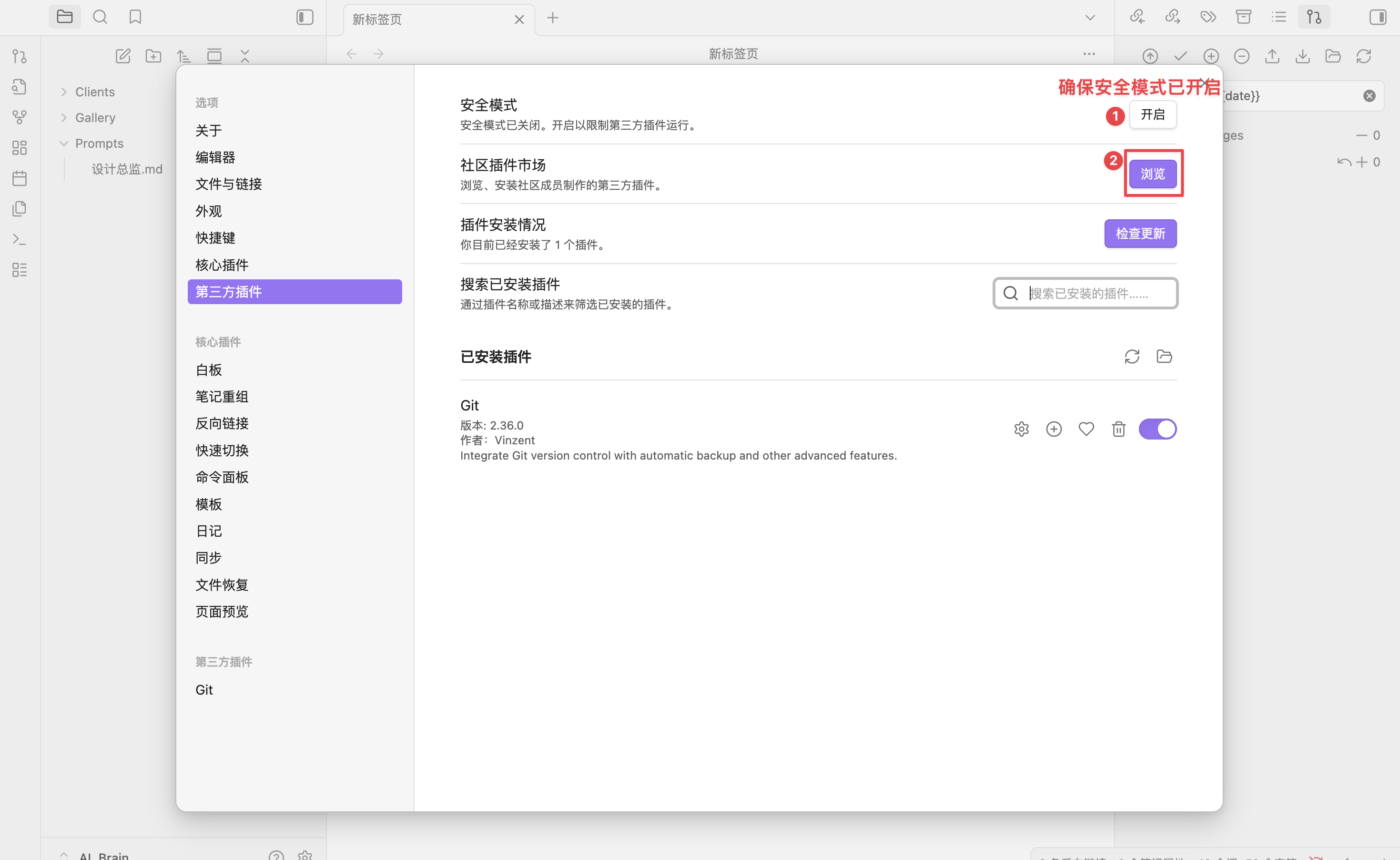 1.2 开启安全模式(当前,是已开启状态),同时,点击"浏览插件市场",搜索"git"并确认正确的工具名(如下图),然后安装。