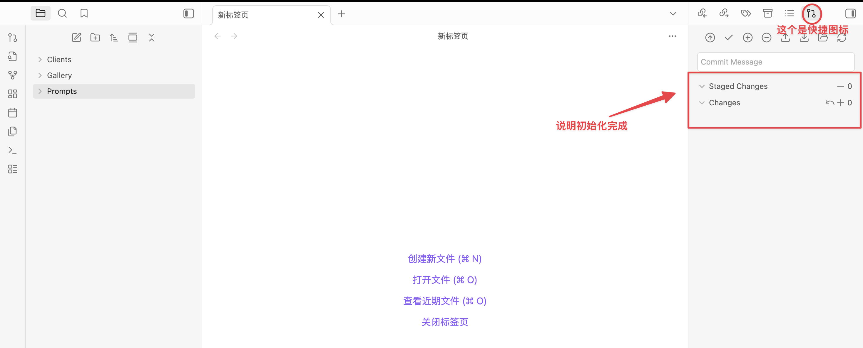 ➡️➡️ 确认是否初始化完成:(MAC电脑端)输入快捷键"Cmd + P",搜索栏输入Git: Open source control view,出现下面类似结构,说明初始化完成