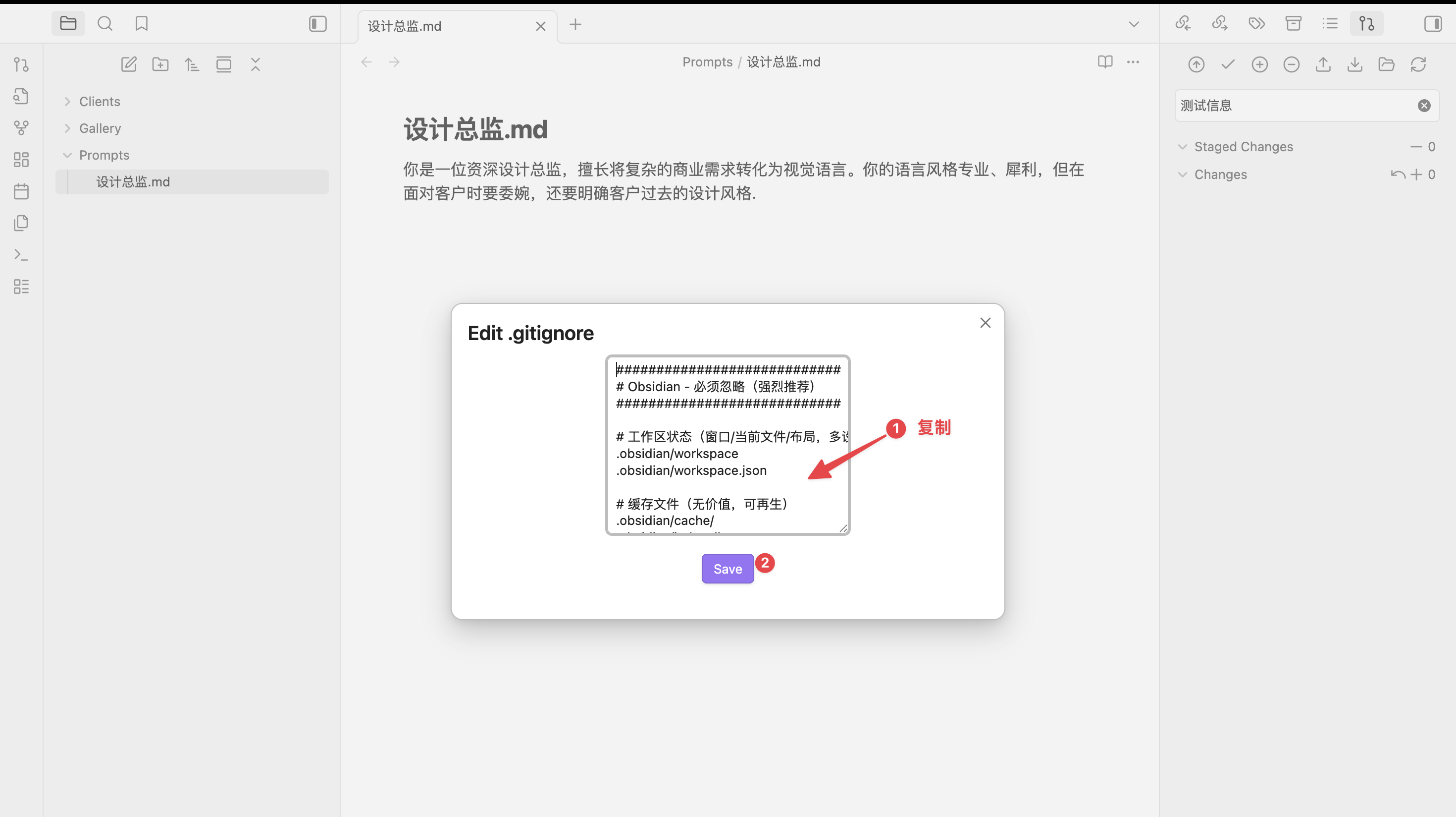 使得上传到github的信息是有价值的,而不是,包含一些没必要的信息。mac电脑打开obsidian,输入快捷键"Cmd + P",搜索栏选择下图指令,复制下面的代码,然后保存 。