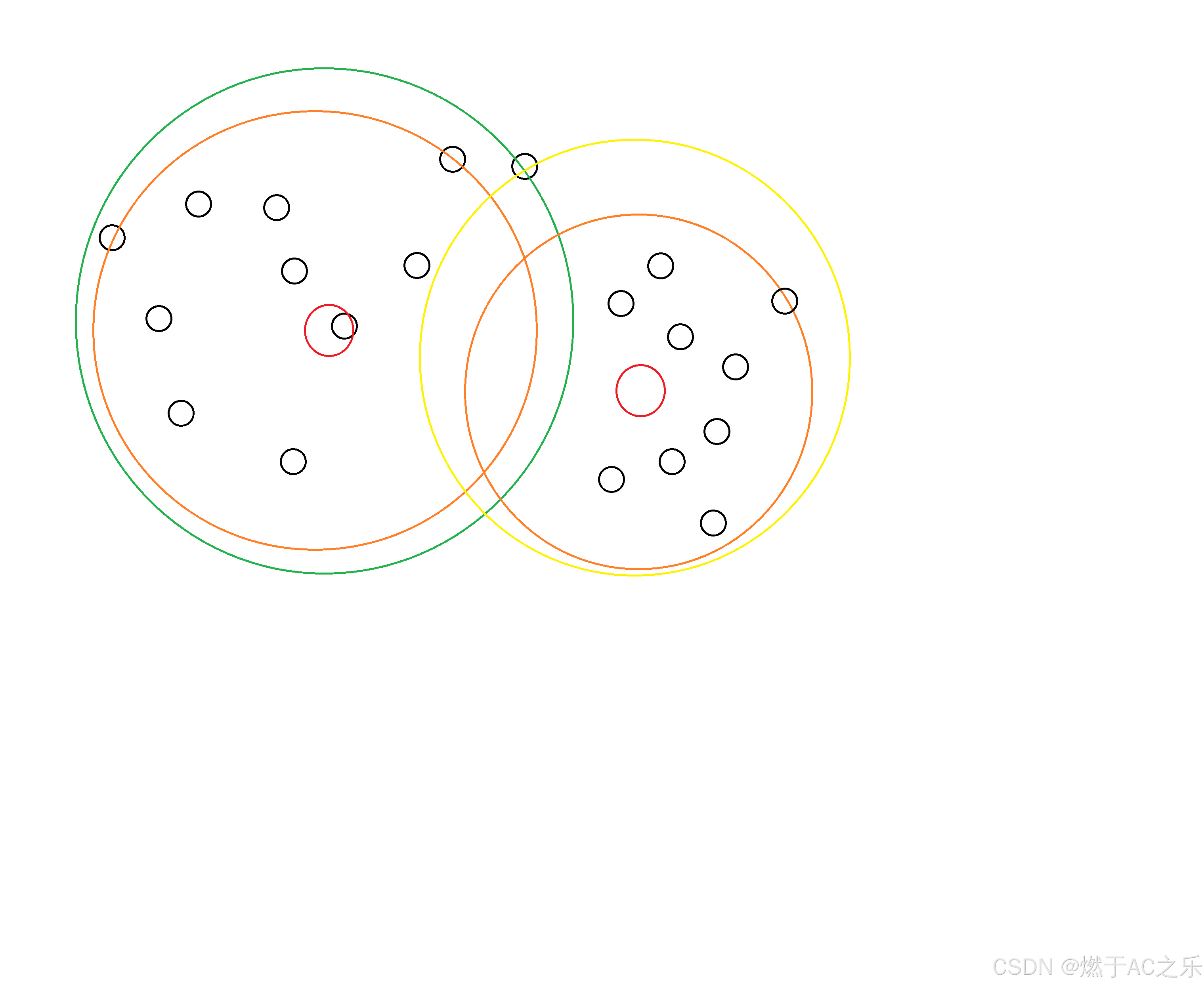 就是固定一个圆的半径,那么它能包含的点就固定,另外一个原的半径就为圆心到未包含的最远的点的距离。