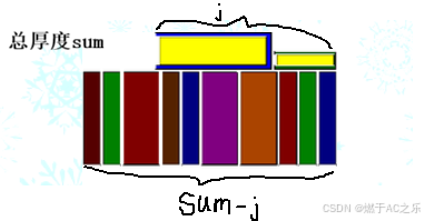 如果看水平放置的书籍,确定下来之后,下面的书籍的厚度是可以用总厚度sum 减去上面书籍的厚度i直接计算出来。这样,我们只用考虑上面书籍的所有厚度下的最小宽度,然后计算对应下面书籍的厚度是否合法即可。计算上面书籍所有可能的厚度下的最小宽度,正好对应01 背包问题。