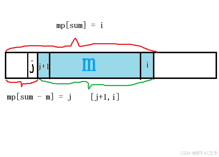 对于一个连续的区间求和,首先想到前缀和进行处理,要找一个区间的值为m,那么就起始点到这点i的和sum(前缀和)➖ 前面某点j的区间和为sum - m即为m区间,注意: 对应m区间下标为 [j + 1, i] 。而要想快速知道前缀和对应的下标,可以用经典的套路 前缀和 + 哈希表 ,mp[sum] = i, 即为前缀和为sum对应的索引。