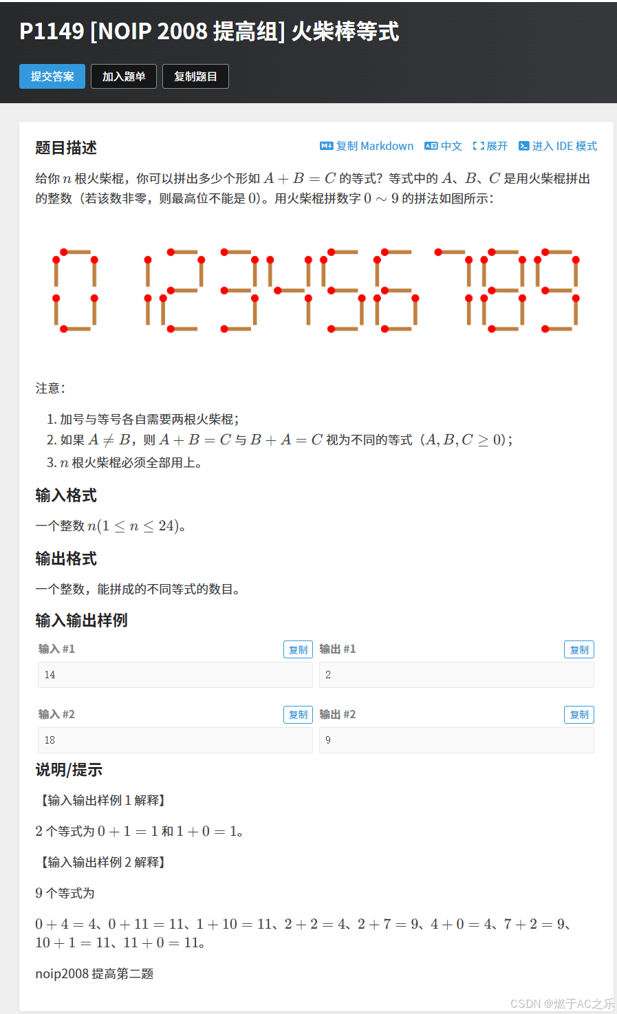 题目: P1149 [NOIP 2008 提高组] 火柴棒等式