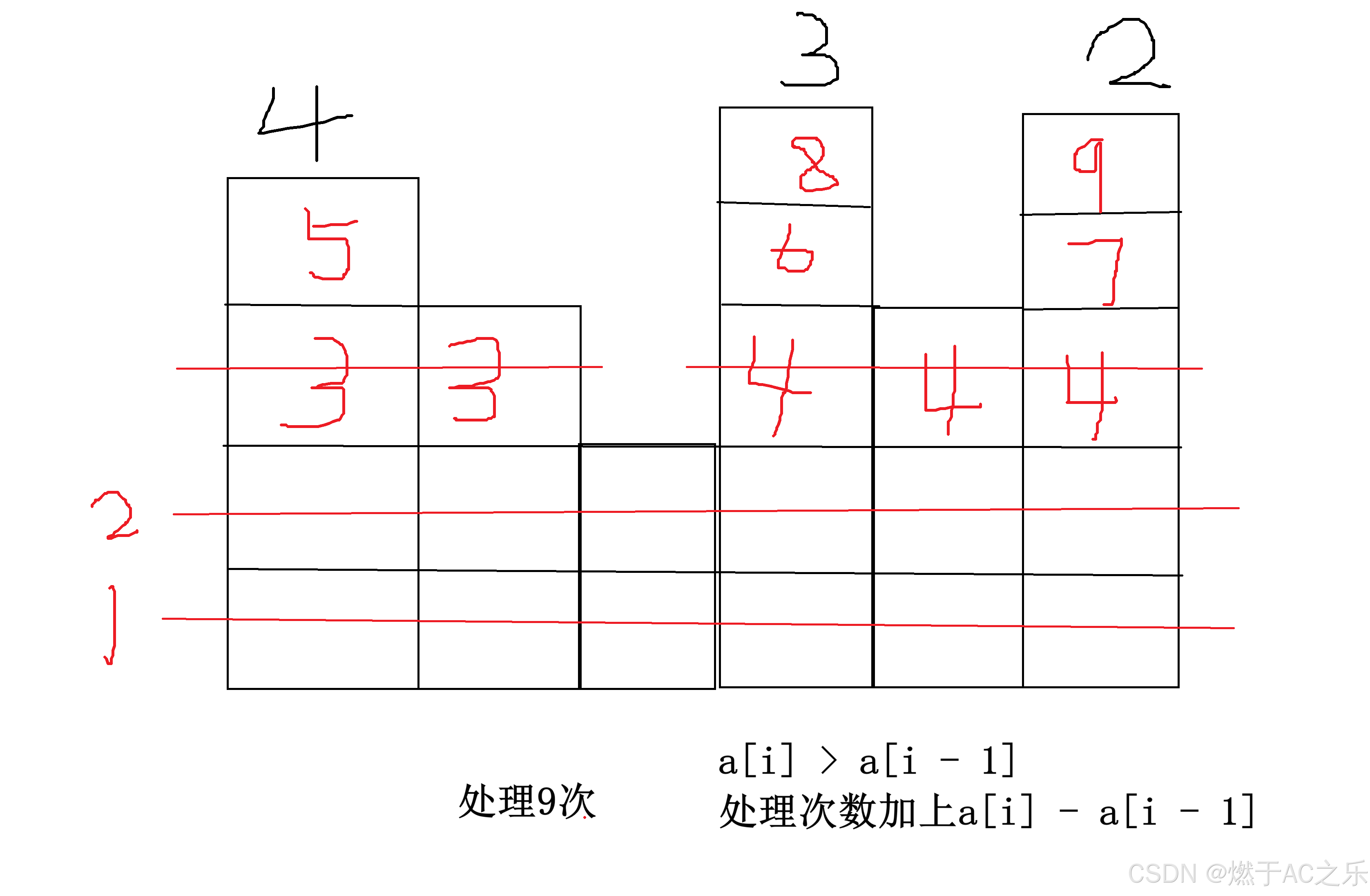 1.a[i - 1] < a[i]: 只需要填上a[i] - a[i - 1], 因为a[i - 1] 的部分会在处理a[i - 1]时填上;