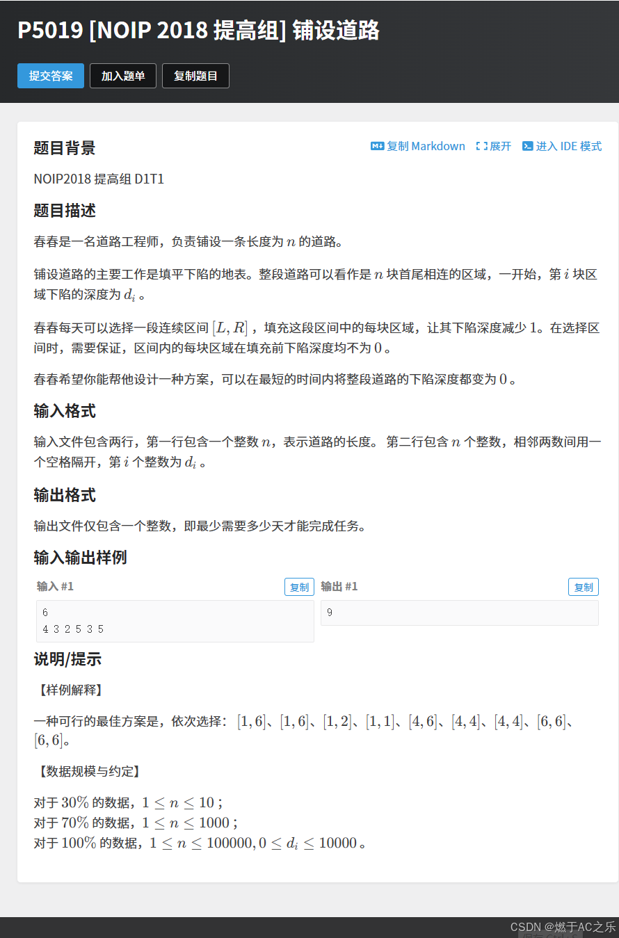 题目: P5019 [NOIP 2018 提高组] 铺设道路