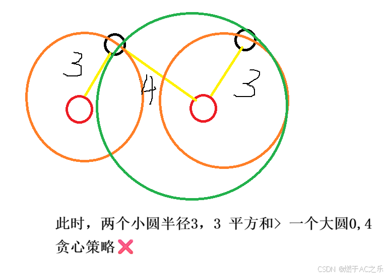 首先,这里很容易想到错误的贪心策略,就是枚举所有的导弹,将每个导弹分配到近的那个中心区域,这样看似满足最短距离,实则错误,如下: