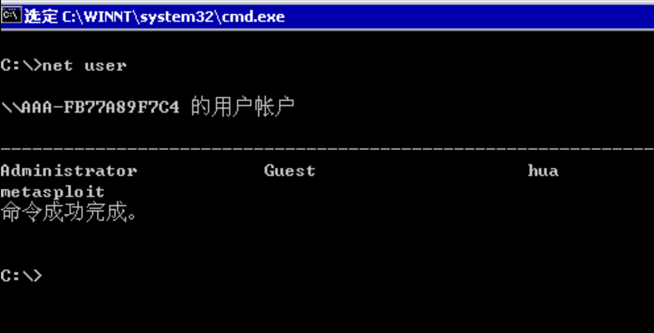 我们可以在 Windows 2000 的 cmd 中使用net user查看是否创建了用户。