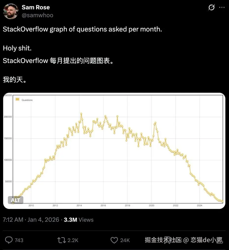 那这对 Tailwind 有什么影响?这不是代表着框架在 AI 时代很流行吗?为什么还会出现"裁员"问题?这个影响其实就类似 AI 对 Stackoverflow 的影响,原网站没流量了: