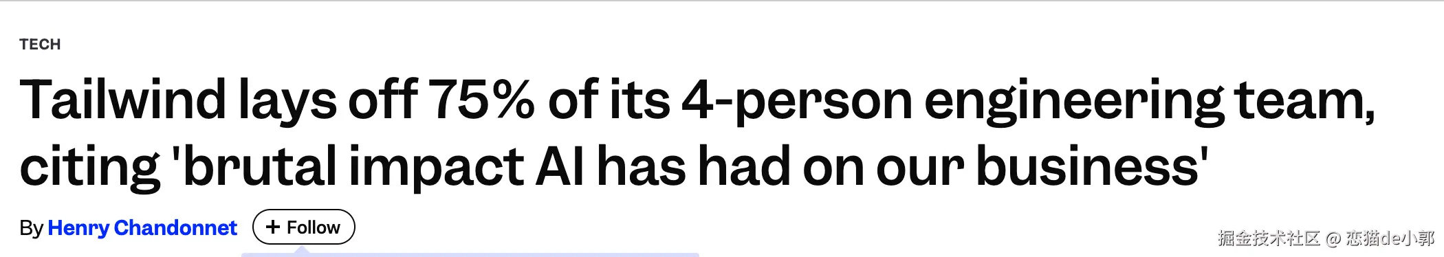 Tailwind 在线文档的流量下降了 40%,收入下降了 80%,实际上写技术文章和公众号的应该也有感受,现在的开发者越来越不喜欢读和找技术文章了,就算读也是让 AI 直接总结。