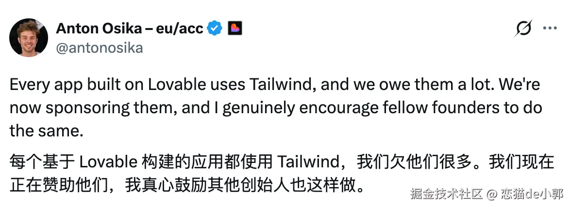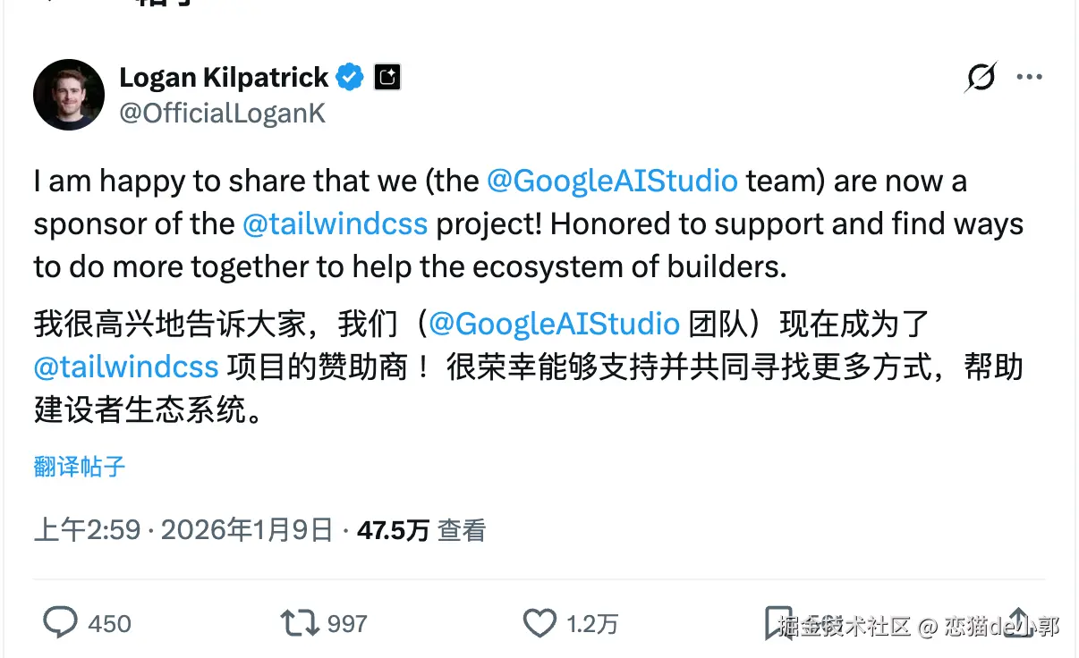 Tailwind 还是相当明白「会哭的孩子有奶吃」这个道理,"裁员风波"才刚开始,立马就收到谷歌 AI Studio 、Vercel 和 Lovable 的相关赞助: