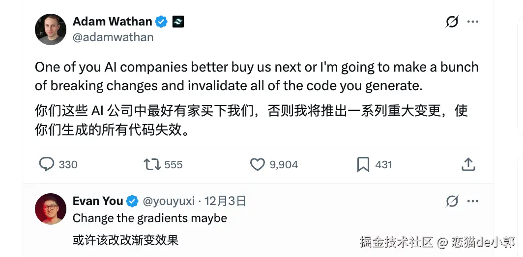 这个风波其实并不是最近才开始的,早在去年年底,Bun 被 Anthropic 收购加入 Claude Code 阵营的之后,Tailwind CSS 的创始人 Adam Wathan 就发出过灵魂警告: