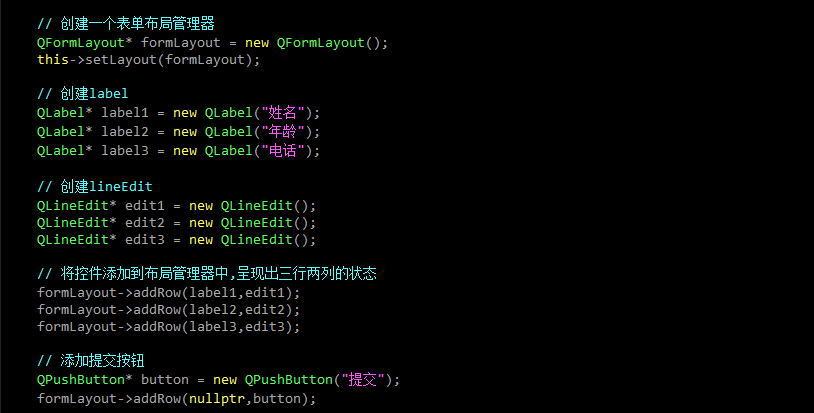 除了上述的布局管理器之外, Qt 还提供了QFormLayout, 属于是 QGridLayout 的特殊情况, 专⻔⽤于实现两列表单的布局.