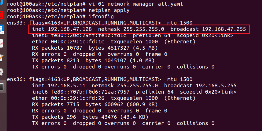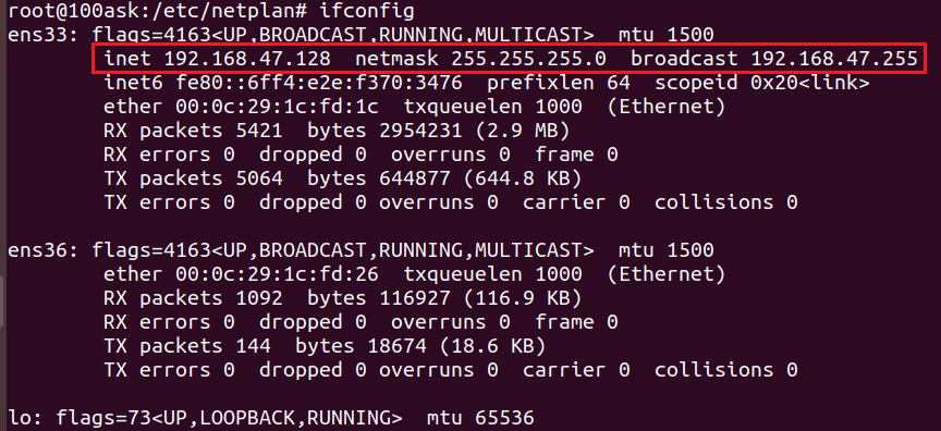 (3)执行重启命令netplan apply 后,查看IP是否配置成功