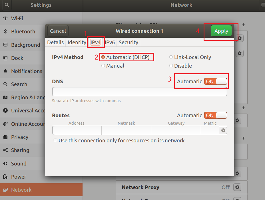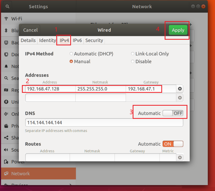 (3)修改IP地址,设置成静态IP,关闭DNS,点击APPLY,