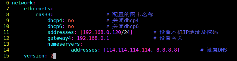 dhcp4: true # (1)ture为开启 (2)no为关闭,no改成false 也可以