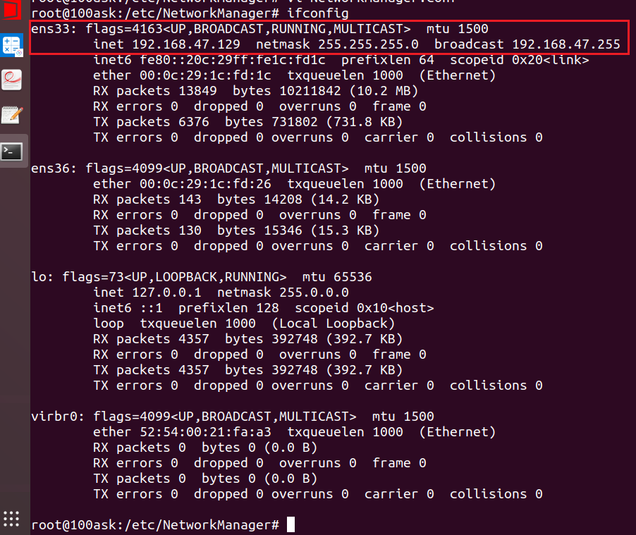 执行ifconfig命令查看网口信息,ubuntu的NAT网卡是ens33(具体NAT网口已实际查询到的为准)。